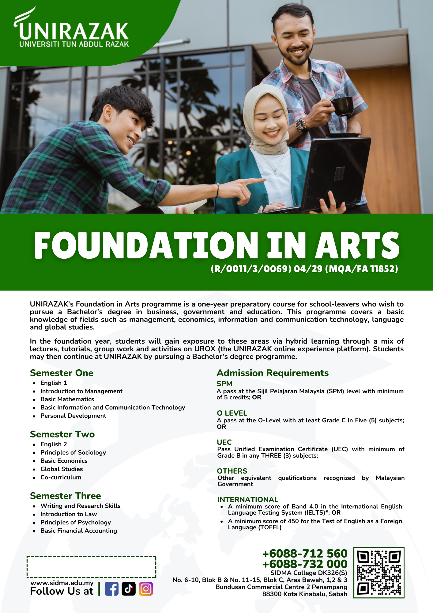 Foundation in Arts covers basic knowledge of an array of fields such as business, management, education, economics, government, public policy, language and general studies.